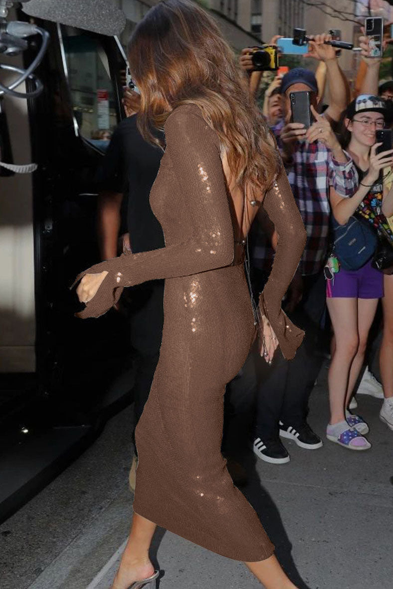 Omfavn elegance med vores flæsede V-hals midikjole, med en flatterende V-udskæring og lange klokkeærmer. De flæsede kanter og tulipankanten tilføjer et strejf af sofistikering, mens det højstrækbare strik sikrer en behagelig, figursyet silhuet.