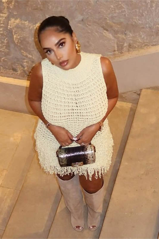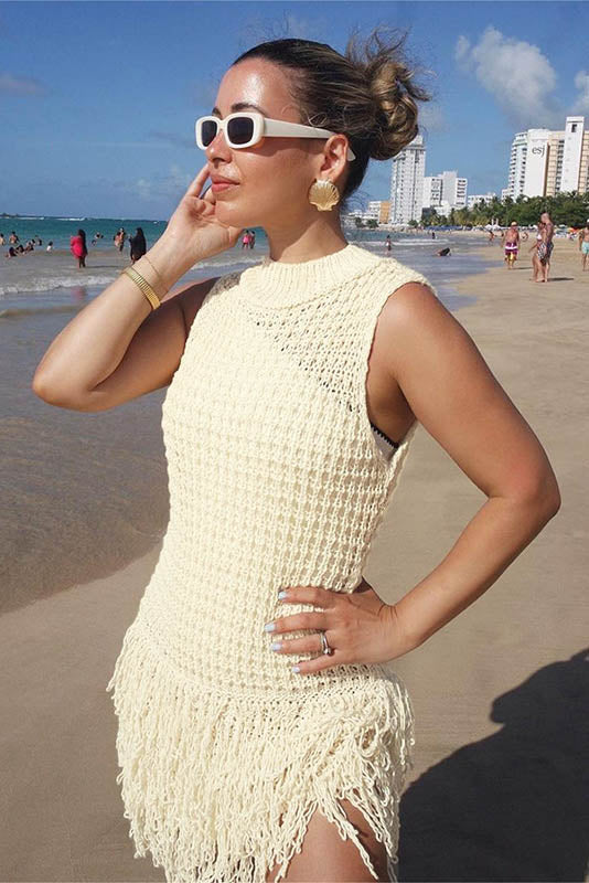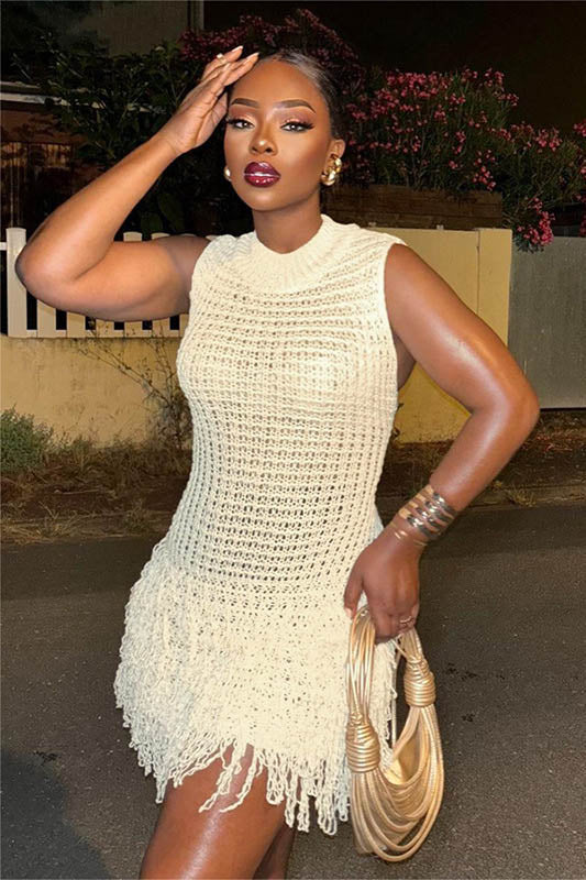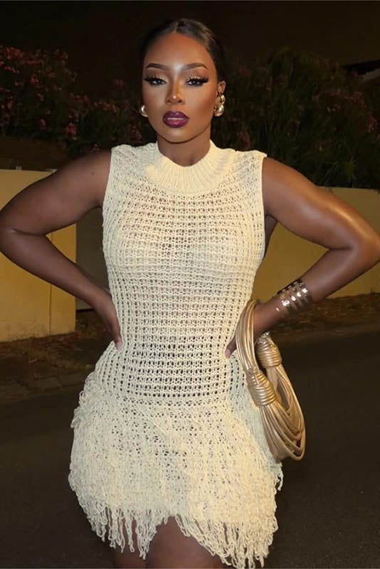 This summer, embrace elegance with this stylish sleeveless dress featuring a chic fringe and hollow-out design. The body-hugging fit accentuates your curves, while the unique patchwork adds a bold, fashionable touch. Perfect for a night out or a special occasion, this dress combines sensuality and sophistication, creating an effortlessly glamorous look. The lightweight fabric ensures comfort while maintaining a sleek and flattering silhouette.