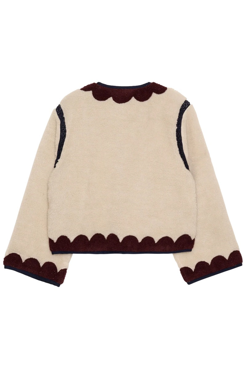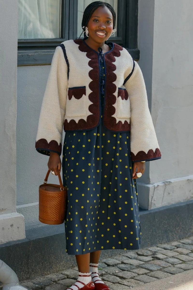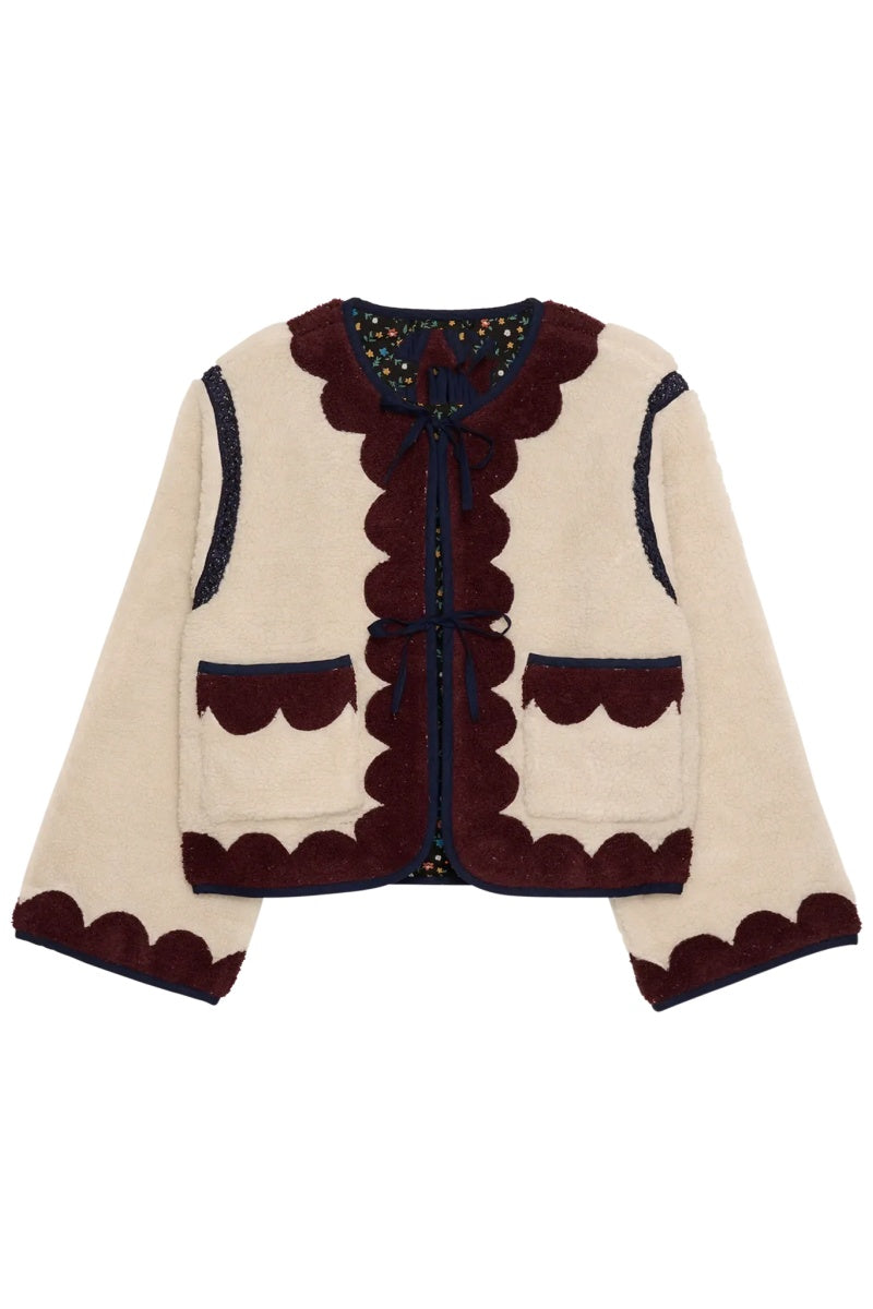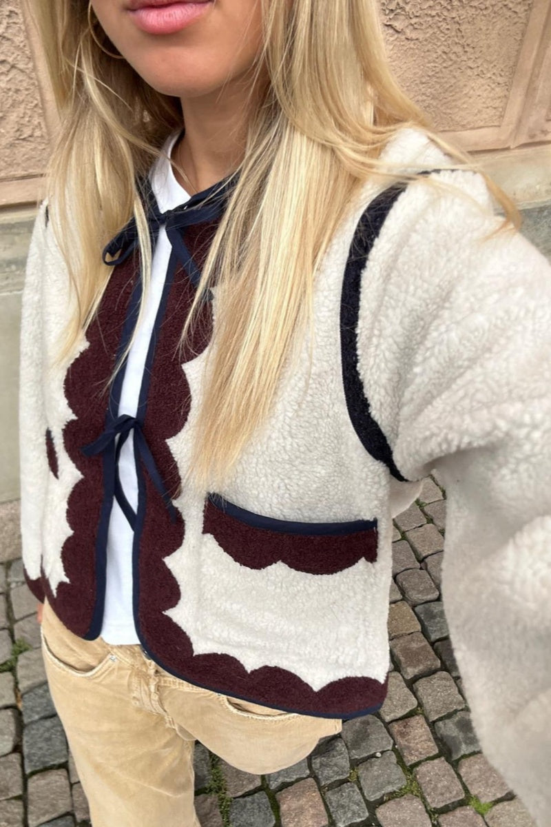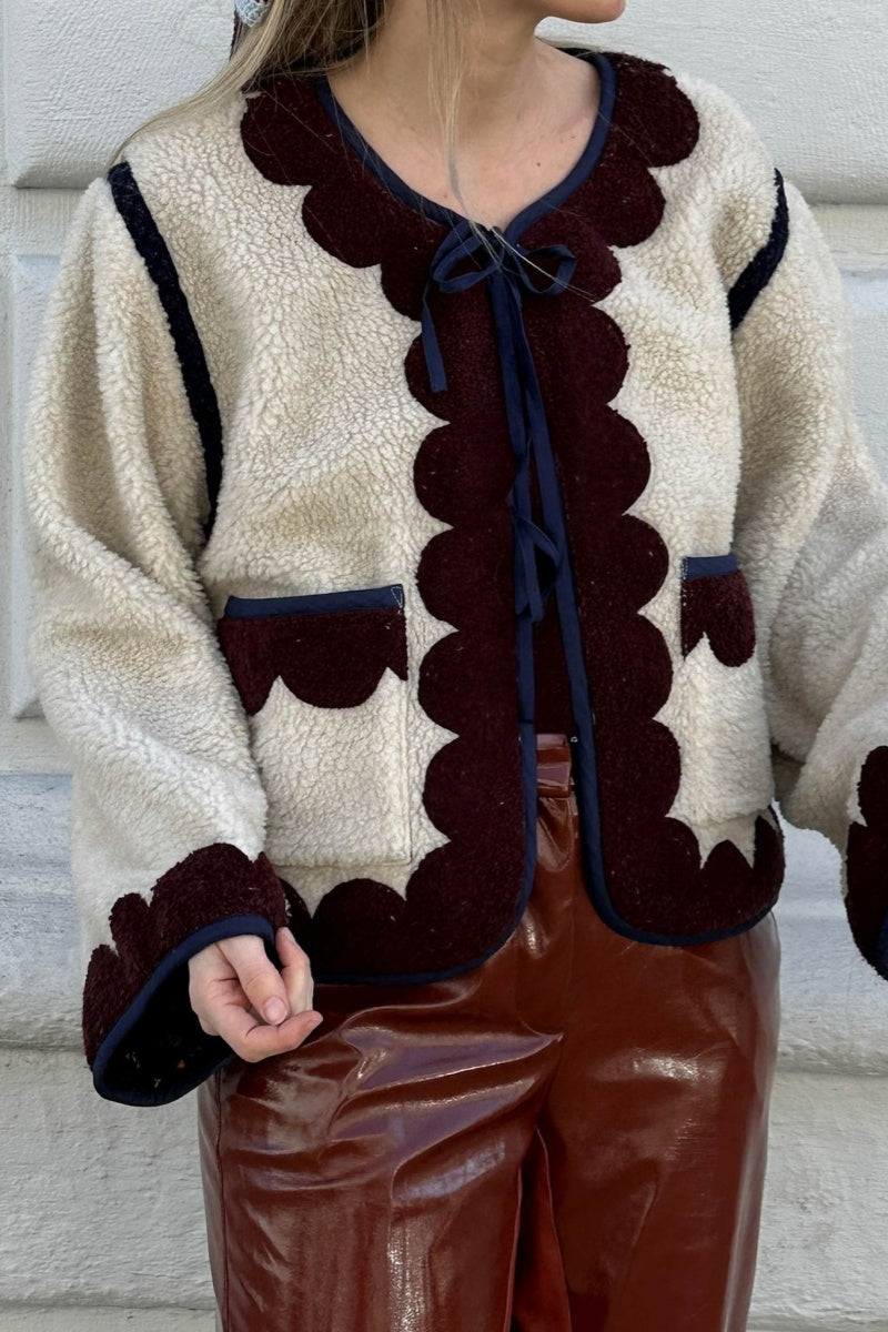 Effortlessly blending charm and comfort, this short casual jacket is designed for everyday elegance. Crafted from soft, breathable fabric, it features long straight sleeves, a curved neckline, and two sets of front ties for a relaxed, feminine touch. A floral cotton lining made from leftover fabric adds a unique, sustainable detail, while piping along the edges enhances the refined finish. Lace trim at the hem and front pockets, paired with delicate cotton lace at the armholes, creates a beautifully romantic silhouette.