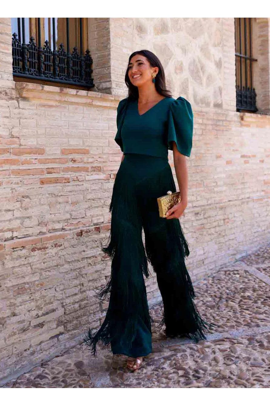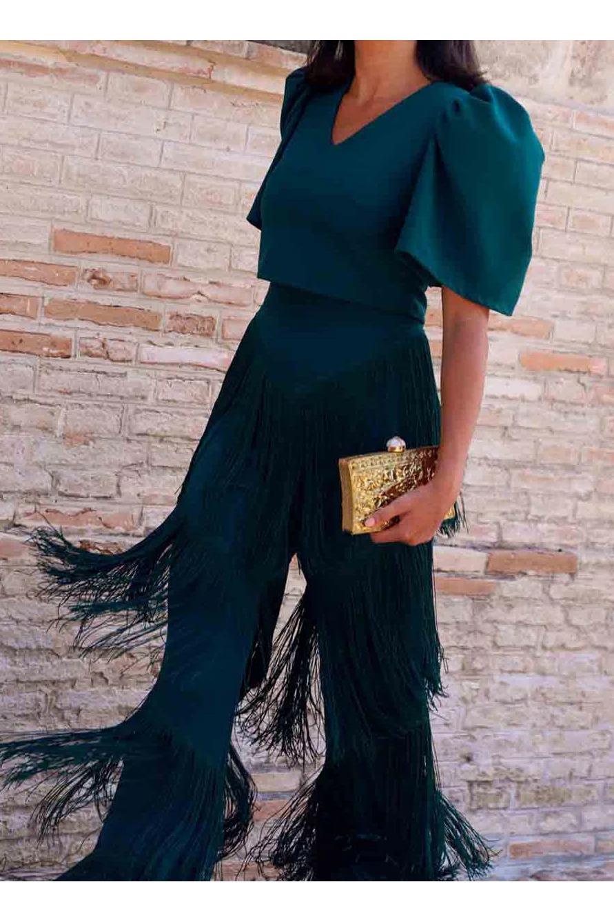 This Fringe Pants Set in emerald green is designed to turn heads with its bold elegance and dynamic flair. The top features a chic V-neckline and voluminous puff sleeves for a refined yet dramatic look, while the wide-leg pants are finished with glamorous fringe that moves gracefully with every step. Tailored for a flattering fit, it strikes the perfect balance between sophistication and playfulness.