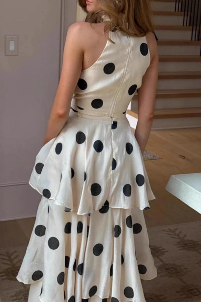 This polka dot printed two-piece set is highly designed. The top is a halter sleeveless style that shows the beautiful shoulder and neck lines, and the polka dot print is retro and eye-catching. The midi skirt adopts a multi-layer cake hem, which is fluffy and flexible, showing a sense of girlishness when walking. The overall style is sweet and vibrant. It looks romantic for daily dates, full of vitality with white shoes for amusement park trips, and is also a perfect prop for taking photos at summer markets. It easily fits various occasions such as dates, outings and markets. No need to worry about matching, one set can create a stunning look.