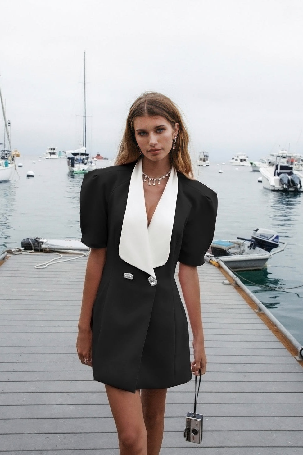 Geef je avondlook een boost met deze prachtige satijnen mini-jurk. Deze jurk heeft een diepe V-hals, gebeeldhouwde schouderlijn en een opvallende uitgesneden achterkant en combineert elegantie met een vleugje allure. De diamanten knopen voegen een vleugje glamour toe, terwijl de uitlopende zoom een ​​flatterend silhouet creëert.