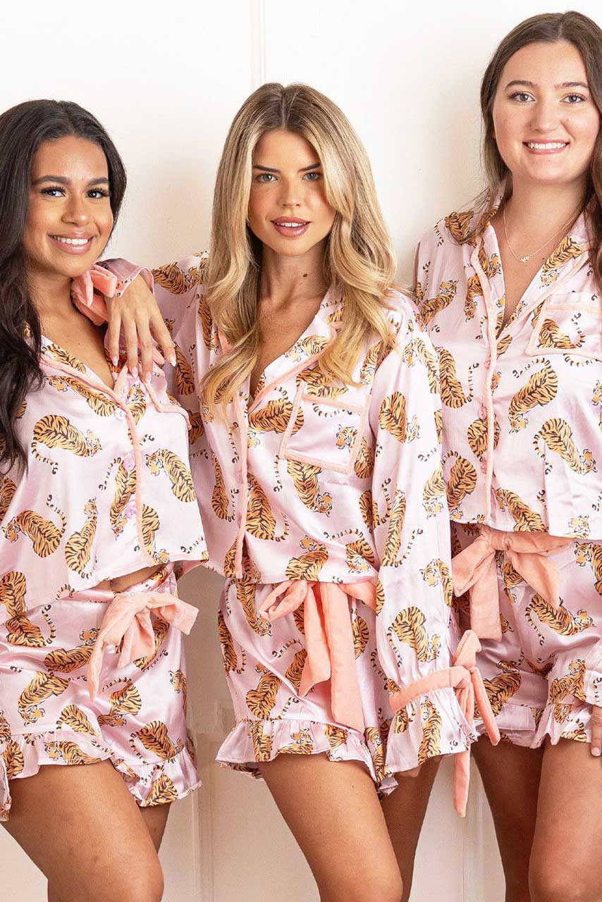 Dette høst- og vinterpysjamassettet har et friskt og søtt design med bjelleermer og volanger som gir det et sjarmerende og feminint preg. Den delikate sløyfeutsmykningen gir en leken, men elegant stil, som gjør den perfekt for en koselig og stilig kveld.