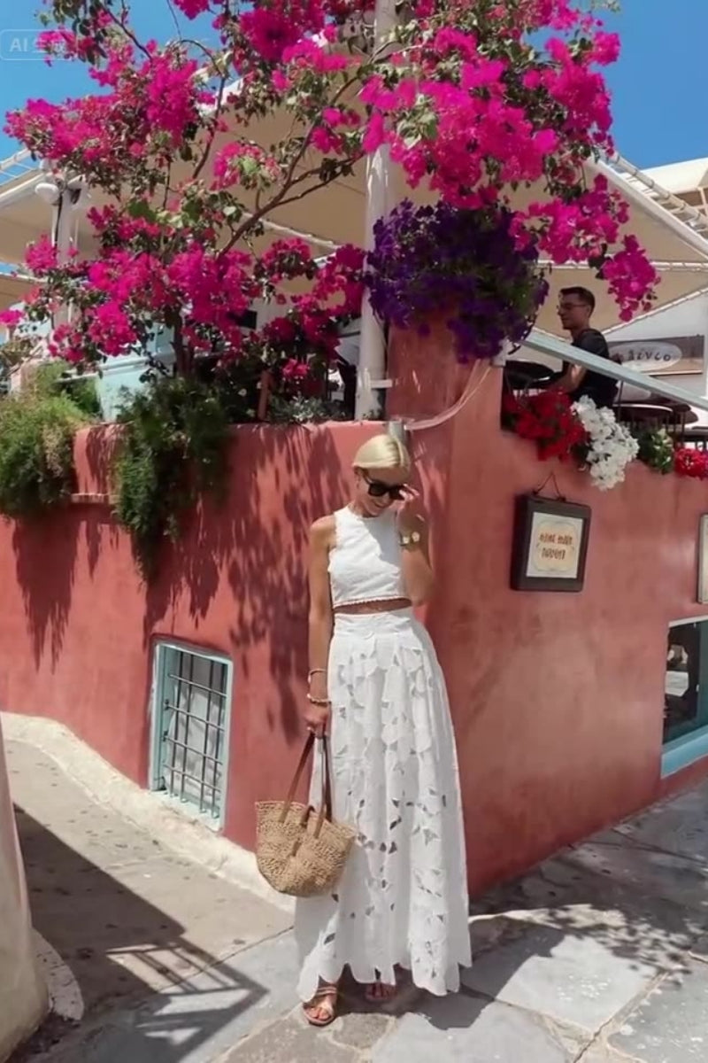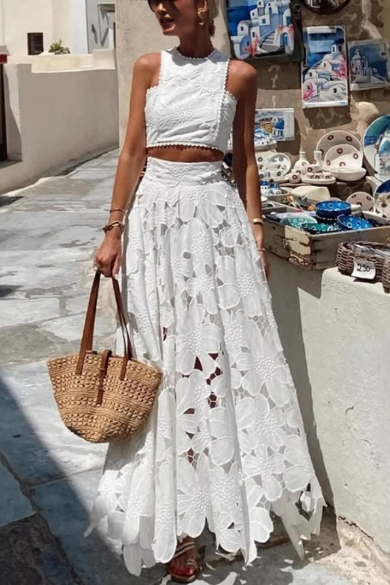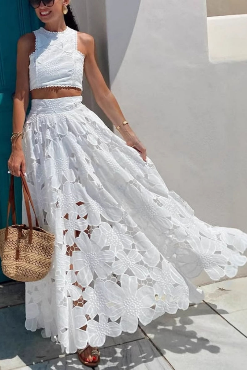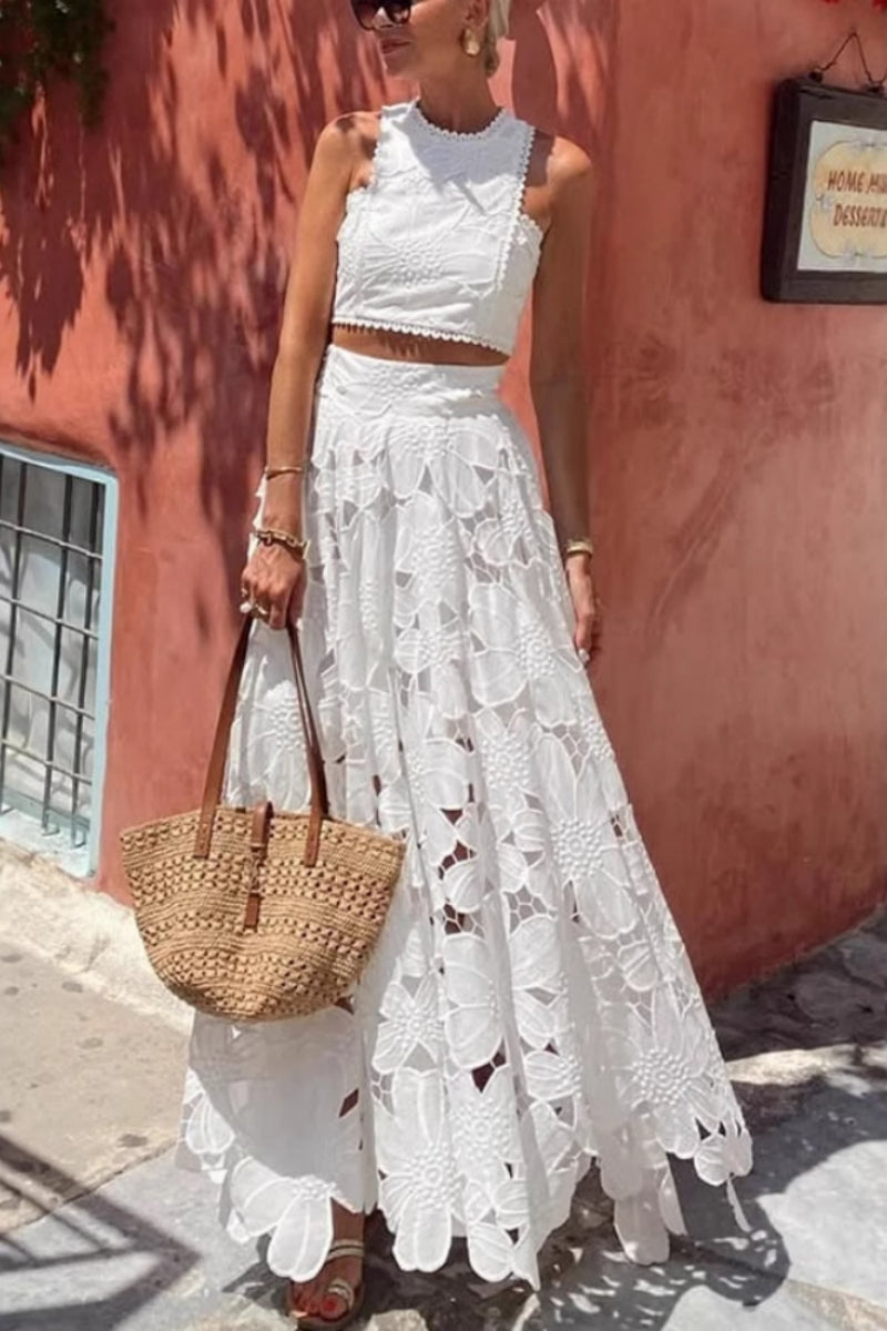 This casual two-piece set features a delicate lace hollow-out tank top, which is breathable and not stuffy, showing exquisite details. The midi skirt has a loose and comfortable version that flatters the hip and leg lines, making it more elegant when walking. The overall style is soft and casual. It looks energetic for daily shopping, gentle and age-reducing with canvas shoes for girlfriend afternoon tea, and also perfect for taking photos during short trips. It easily fits various casual occasions, no need to worry about matching, one set creates a fashionable look.