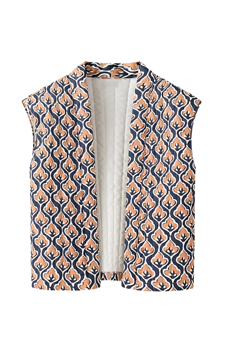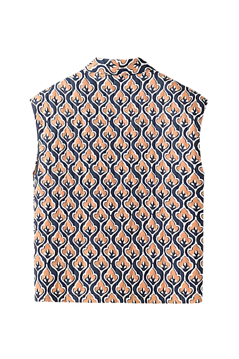 Şık baskılı desene sahip bu şık, tek sıra düğmeli yelek ceketle gardırobunuzu zenginleştirin. Dayanıklı polyesterden üretilen dar kesim tasarımı ve klasik yuvarlak yakası, şık ve göz alıcı bir siluet oluşturur. Göz alıcı baskı, zarif bir görünümü korurken çağdaş bir dokunuş katıyor.